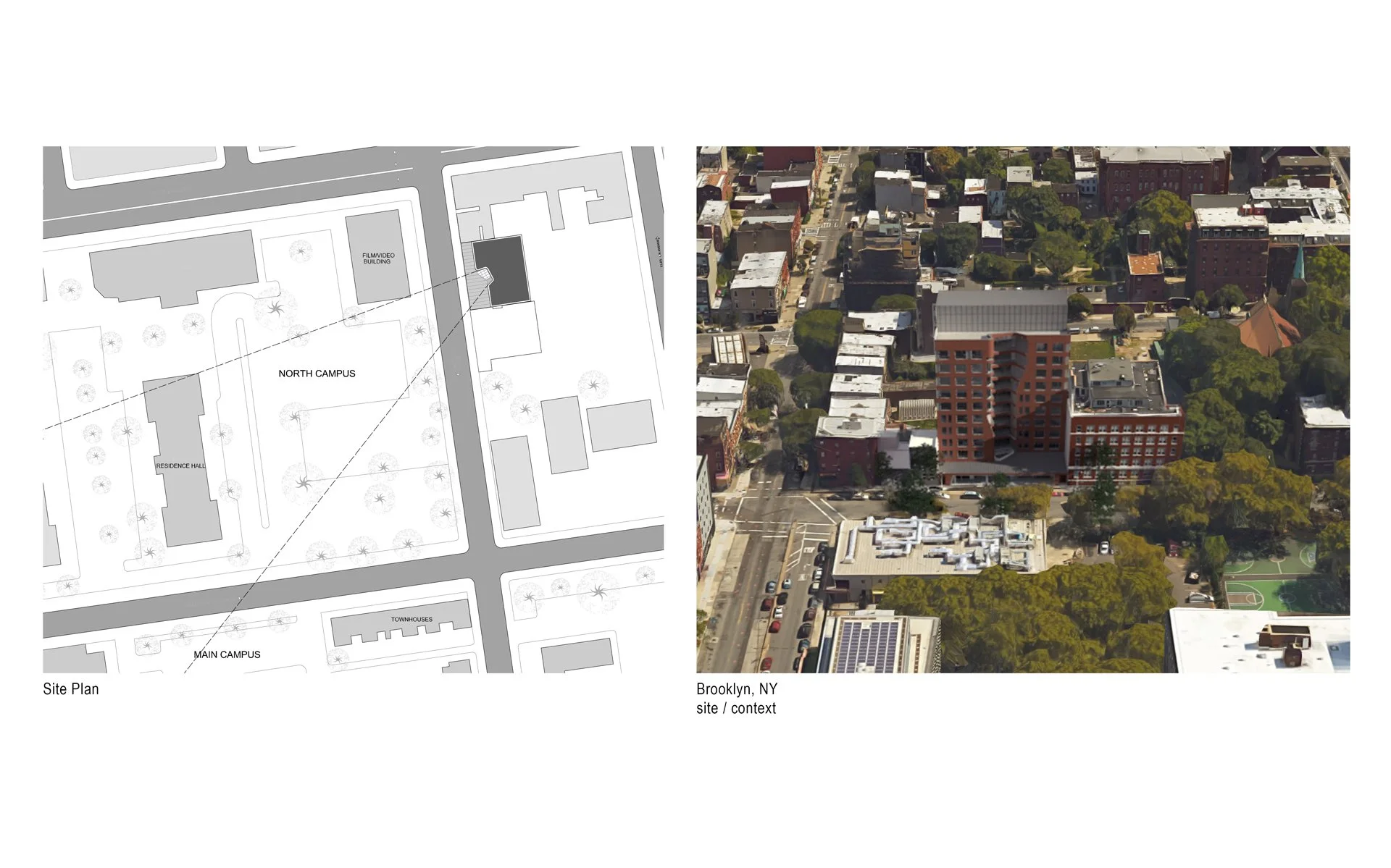 The building is located approximately one block from the main campus gate, embedded within the Brooklyn’s Clinton Hill neighborhood. The main floors are set back from the street with the entrance through a one-story podium. Within this podium students can use the central event space for social or study activities as well as the adjacent maker spaces which include studio resources. Upper floors of the tower are composed of 14 rooms for two students each. Shared, compartmentalized bathrooms are distributed throughout the floor. The central lounge on each floor has a work counter and furniture for community use. The tower exterior is composed primarily of brick with curved stainless steel panels. These materials are intended to actively engage the historic brick campus and neighborhood while setting apart the distinctive forms of the central void and lounge spaces.