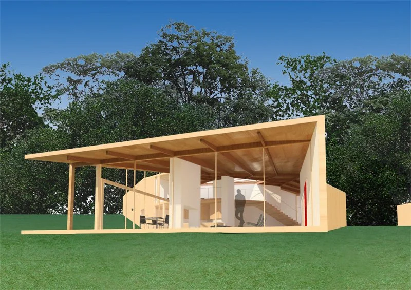 The design of the house for Lot 4 in the White’s Hill Road development is based upon the unique characteristics of the property and the exceptional surrounding views and orientations. The house is placed on a gentle mound of land that is approached from the southeast, while a softly running creek with a dramatic view of a tall ridge is located to the southwest. The third site feature – and the most unusual one – is a narrow cleft of rock northwest of the house with rock ledges on each side.